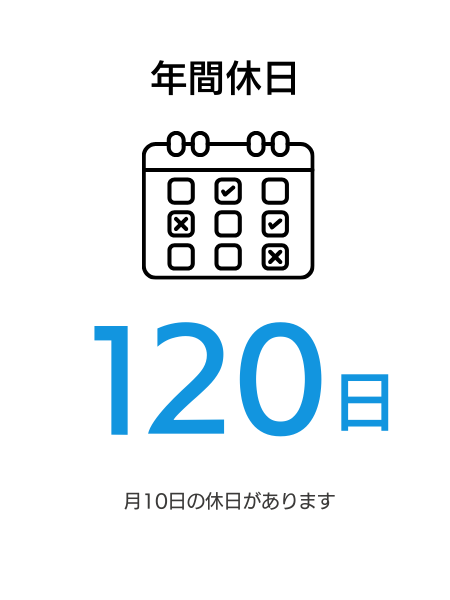 | 休日休暇 | 年間休日120日(月10日休み/GW、夏季、年末年始) ※休日は担当業務のカレンダーに準じます |