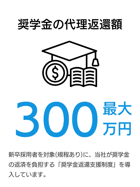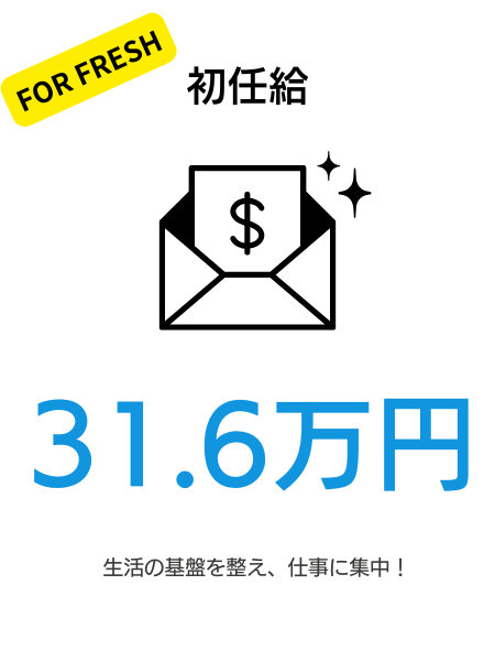 初任給31.6万円、住居負担1.5万円、さらに奨学金返還支援。挑戦を支える、圧倒的な土台を用意。お金の不安をゼロにし、世界を切り拓くことだけに没頭できる。